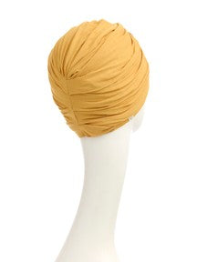 Copricapo senza nastri in tessuto arricciato. Colore ocra.